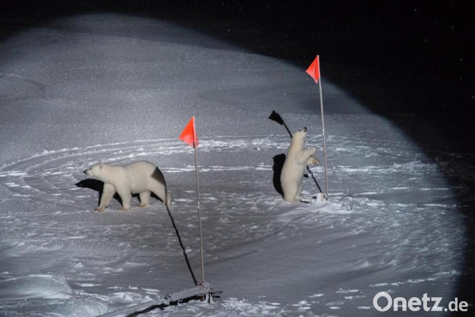 World Press Photo 2020, Kategorie ENVIRONMENT - FIRST PRIZE, SINGLES: Eisbärenmutter und -junges betrachten auf einer Eisscholle Flaggen und Ausrüstung neben dem Polarstern-Schiff (Titel "Polar Bear and her Cub").
