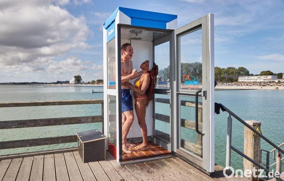 An der Ostsee ist eine kuriose Dusche zu finden: Auf der Seebrücke in Großenbrode (Schleswig-Holstein) wurde 2023 ein ehemaliges Telefonhäuschen aufgestellt, in dem sich Strandbesucher mit dem Salzwasser der Ostsee duschen können.