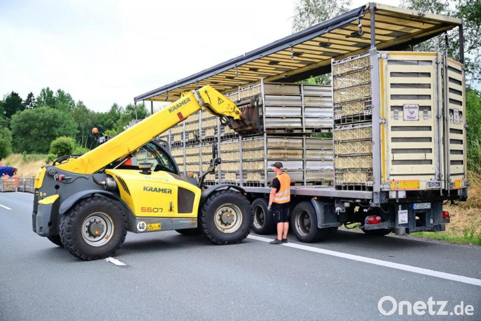 Die Bergung der in Gitterboxen transportierten Masthähnchen werde sich voraussichtlich über mehrere Stunden ziehen, sagte ein Polizeisprecher am Dienstagmorgen. „Es muss erstmal ein Ersatz-Lastwagen der Firma kommen, dann werden ganz vorsichtig die Gitterboxen umgeladen.“ Ein Amtstierarzt sei zum Unfallort gerufen worden, um den Zustand der Tiere zu beurteilen und „Entscheidungen im Sinne des Tierwohls zu treffen“.