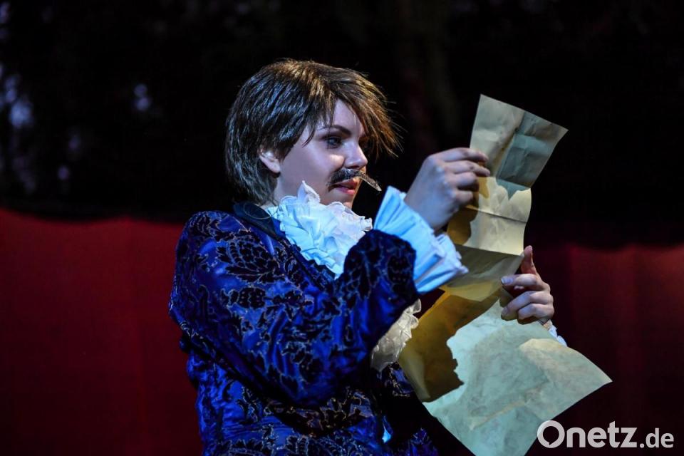 Shakespeare hadert zunächst, bis die theatersüchtige Viola de Lesseps sein Dasein als Autor und Mensch in Aufruhr bringt. Während er um die mit Lord Wessex (stark: Georg Münzel) verlobte Frau wirbt, spielt sie ihrem bewunderten Autor in einem aberwitzig-desaströsen Casting als Romeo vor. Da Frauen im Elisabethanischen Zeitalter die Theaterbühne verwehrt ist, verkleidet sie sich als Mann. Ricarda Seifried wirbelt elegant zwischen den Geschlechterrollen und brilliert in Momenten wie einem gender-verwirrenden Kusstraining, in dem Shakespeare der als Romeo verkleideten Viola demonstriert, wie sie seine/ihre Geliebte (Matthias Zeeb) küssen soll.