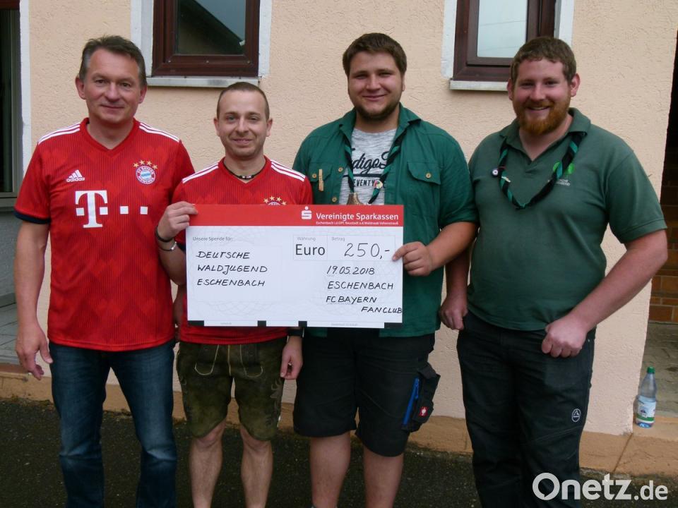 Die Festhalle des SCE war am vergangenen Samstag Versammlungsstätte des FC Bayern-Fanclubs „Die Roten“. In froher Erwartung harrten auf den Sieg ihres Clubs beim Endspiel um den DFB-Pokal. In froher Erwartung waren auch Angehörige der Waldjugend, denen eine Spende aus Verkaufserlösen örtlicher Veranstaltungen angekündigt war. Fanclub-Vorsitzender Michael Brüchner überraschte die Waldläufer mit einer Zuwendung von 250 Euro. Für Stefan Grünwald ist sie ein unerwarteter Beitrag für ein Vorhaben in den Pfingstferien. Die Waldläufer fahren zu einem Landes-Forsteinsatzlager der Waldjugend des Landesverbandes Baden- Württemberg in die Schwäbische Alb.