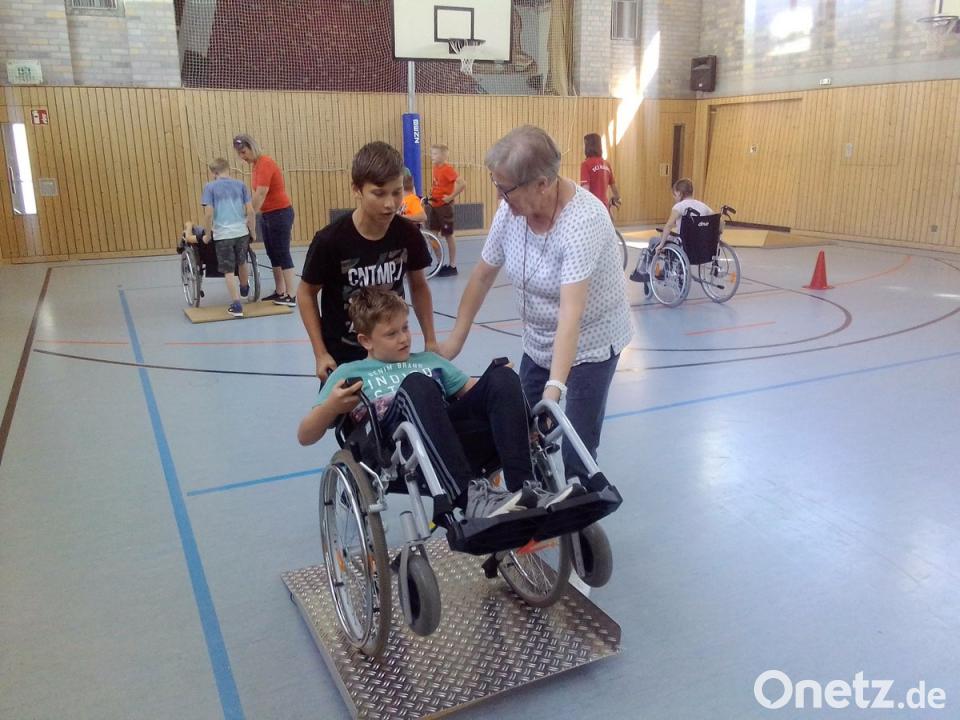 Nach dem theoretischen Unterrichtsteil leiteten Götz und Grüner zur Praxis über und teilten die Schüler für sechs Stationen in Gruppen auf. Zum Rollstuhlparcours gehörten das Zerlegen und Falten von Rollstühlen, das Fahren über schräge Flächen und Kanten ohne umzukippen und ein Basketballspiel im Rollstuhl. Im steten Wechsel hatten sich die Kinder in die Situation eines Behinderten zu versetzen.