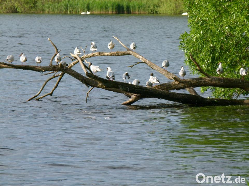 Auch Lachmöwen, der Charaktervogel und auffälligste Erscheinung im Rußweihergebiet, zeigen sich gerne am „Laufsteg“. Aufzeichnungen über ihre heimische Brutkolonie reichen zurück bis ins Jahr 1626. Auffällig ist, dass sie ihr raues Kreischen am „Laufsteg“, wie hier am Rand des 92 Hektar großen Obersees, einstellen und die Sonne genießen.