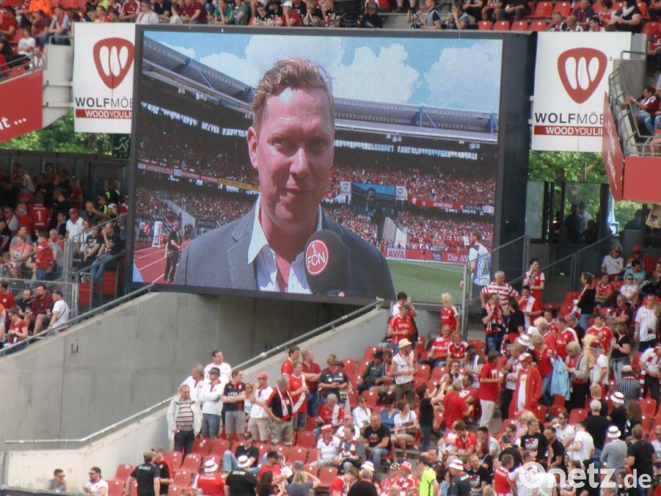 Auftritt vor 50 000 Zuschauern im Nürnberger Stadion: Unternehmer Bernd Godelmann (hier auf Großleinwand) übergab einen 5000-Euro-Gutschein an den Sieger des Wettbewerbs "Steine für Vereine". Bild: hou
