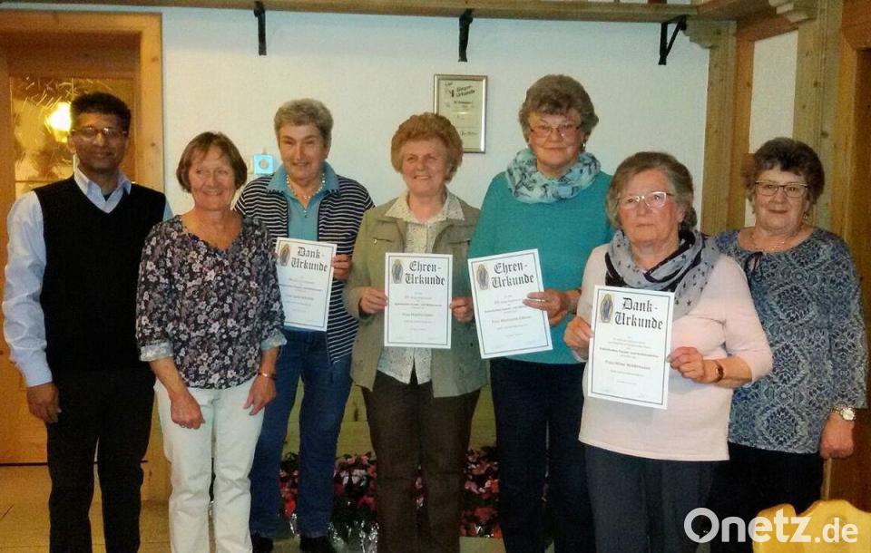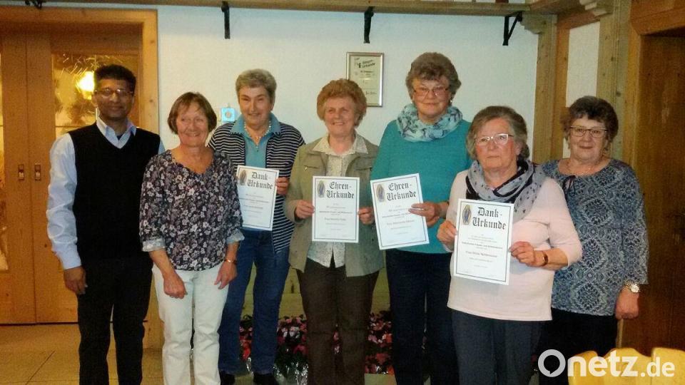 Für ihre langjährige Mitgliedschaft im Mütterverein dankten Pfarrer Joseph und die Vorsitzenden Monika Seidel (von links) und Irene Hasenfürter (rechts), Martha Höfer und Marianne Etterer (Vierte und Fünfte von links). Für ihre langjährige Mitarbeit in der Vorstandschaft wurden Lucia Schmidt (Dritte von links) und Hilde Wildenauer (Zweite von rechts) ausgezeichnet.