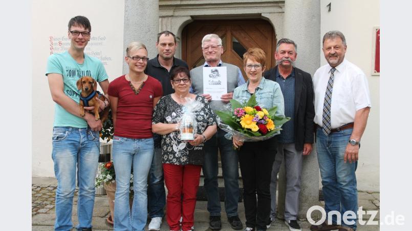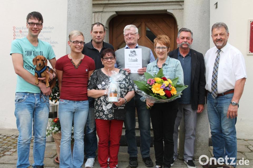 Bürgermeister Johann Maurer (rechts) war sicher: "Wenn es Ihnen bei uns nicht gefallen würde, kämen Sie sicher nicht so oft." Und das ist bei Hermann Warneke aus Schneverdingen (Vierter von rechts) seit 20 Jahren der Fall. Mit Familienangehörigen und Bekannten reist er seit 1998 aus Niedersachsen ins Grenzland und schlägt in der Ferienwohnung von Evi und Günther Schönberger in Neuenhammer (Dritte und Zweiter von rechts) sein Quartier auf. "Hier fühlen wir uns einfach pudelwohl", schätzt Warneke Qualität und Gastfreundschaft. In der Feierstunde im Gasthaus "Hammerwirt" dankten die Schönbergers den Stammgästen mit einheimischen Spezialitäten. Warneke revanchierte sich mit einem Blumenstrauß für die Gastgeberin. Maurer überreichte eine Urkunde als Dank. Bild: pi
