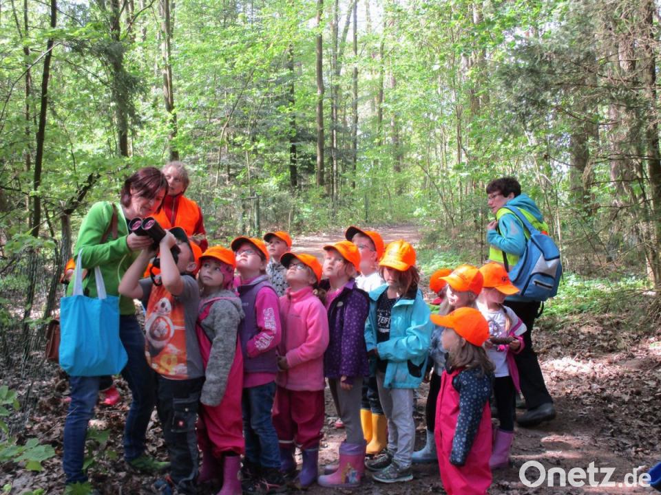 Lauschen, Entdecken und Schauen war angesagt bei der Waldexkursion mit Försterin Renate Feuchtmeyer (l.). Natürlich wollten alle einmal durch das Fernglas schauen und das Vogelnest im Baumwipfel entdecken.