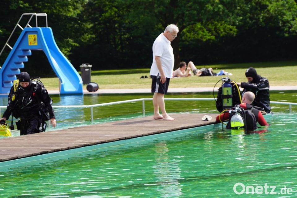 Dem kühlen Samstagvormittag folgte schwülwarme Luft, die sich am Nachmittag in Blitz und Donner entlud. Nicht unbedingt ein Wetter für Sonnenanbeter, und so bot das Becken den Gerätetauchern ausreichend Platz für ihren Sport. Eines ist sicher: Wenn das Wetter mitspielt, ist die großzügige Liegewiese, sind die Kinderspielplätze, die Strandkörbe beim Kinderbecken, der Biergarten und alle Einrichtungen voller Erholungssuchender.