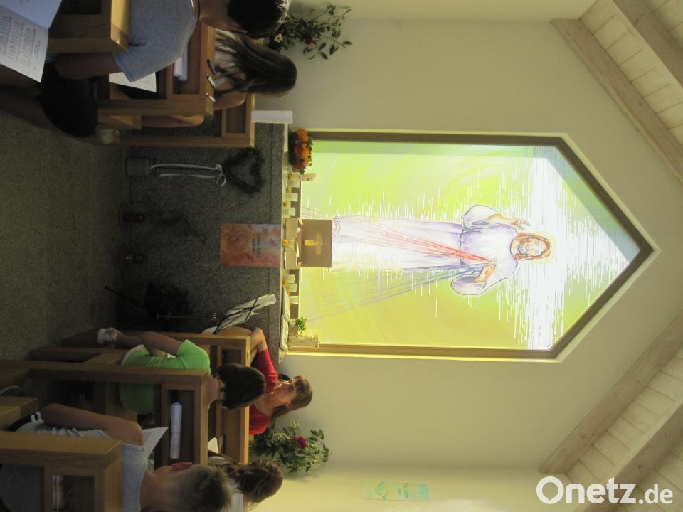 Der Weg führte anschließend über Röthenbach in die ausgedehnte Natur neben der Bahnlinie, wo auf einer Wiese ein längeres Picknick stattfand. Über Fußlohe und Drahthammer wanderte man zu zwei Haltepunkten in Reuth und weiter zum Bahnhof. Nach Überquerung der Bundesstraße ging es durch das Eichelholz zur Barmherzigkeitskapelle der Familie Adam in Eiglasdorf, wo Hasenfürter mit ihrer Gitarre eine wundervolle Andacht für die Firmlinge vorbereitet hatte. Auf diese Weise geistig bestärkt ist die letzte Wegstrecke zurück zur Pfarrkirche gleich viel leichter gefallen. Nach über vier Stunden Glaubensabenteuer in Gottes Natur waren alle freudig überrascht als im Pfarrgarten, dem 17. Haltepunkt des Tages, Getränke und Eis auf sie warteten. Pfarrer Neumaier bedankte sich bei den Teilnehmern für das Mitmachen und bei Kerstin Hasenfürter mit einer Rose aus dem Pfarrgarten für die umfangreiche Vorbereitung, die Mühe und Durchführung des gelungenen und abwechslungsreichen Nachmittages.
