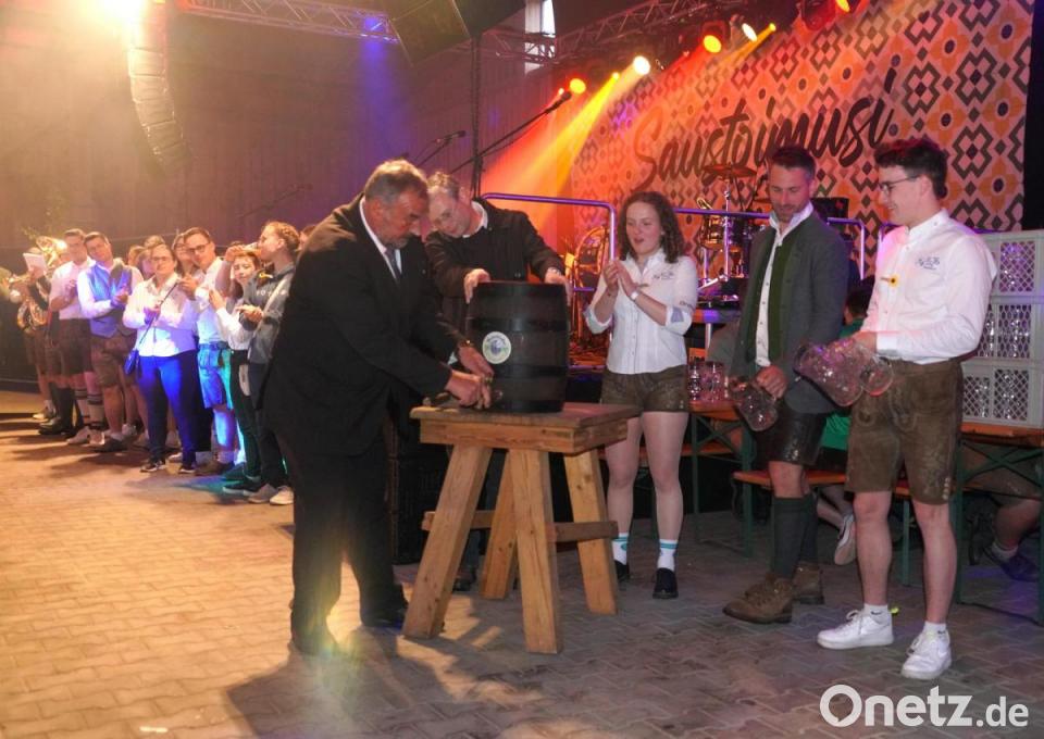 Undramatisch und gekonnt war das Anzapfen durch den Bürgermeister, Pfarrer Götz sorgte dabei für die Stabilität des Fasses. Beimler jagte den Zapfhahn in das Fass und schon sprudelte das süffige Bier in die Masskrüge. Nicht fehlen durfte anschließend das „Auf eine friedliche Wiesn“ von Simon Schwab in das weite Rund der Halle.