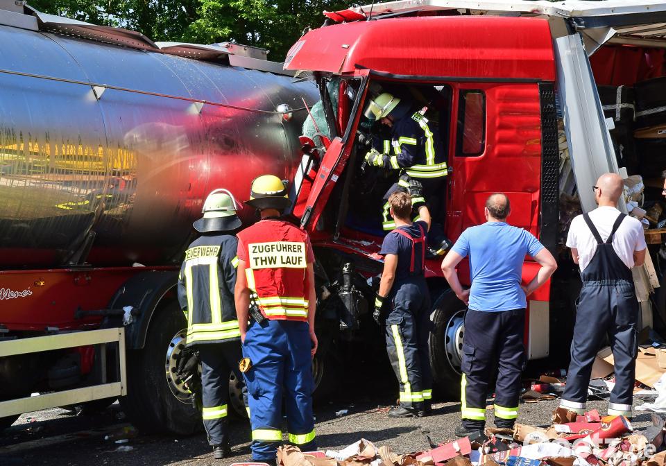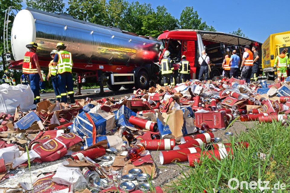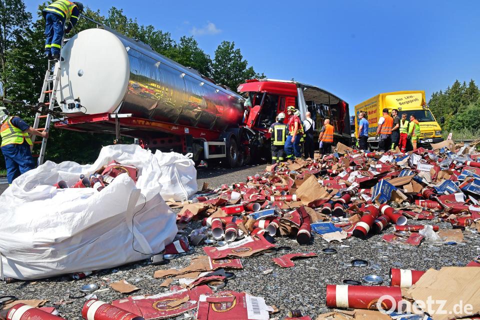 Ein Lastwagen, vollbeladen mit Whisky, fuhr am Samstagmorgen um 5.20 Uhr ungebremst auf einen Milchlaster auf. Bei dem Unfall auf der Autobahn 6 zwischen den Anschlussstellen Alfeld und Sulzbach-Rosenberg wurde der Fahrer des Whiskylasters eingeklemmt. Rettungskräfte mussten den 41-Jährigen aus seinem Führerhaus befreien und brachten ihn ins Klinikum St. Marien in Amberg, am Sonntag durfte er das Krankenhaus aber bereits wieder verlassen. Auch ein Rettungshubschrauber war im Einsatz. Die Autobahn war in Richtung Tschechien über mehrere Stunden gesperrt. Erst um etwa 14.15 Uhr war die Strecke wieder frei befahrbar.