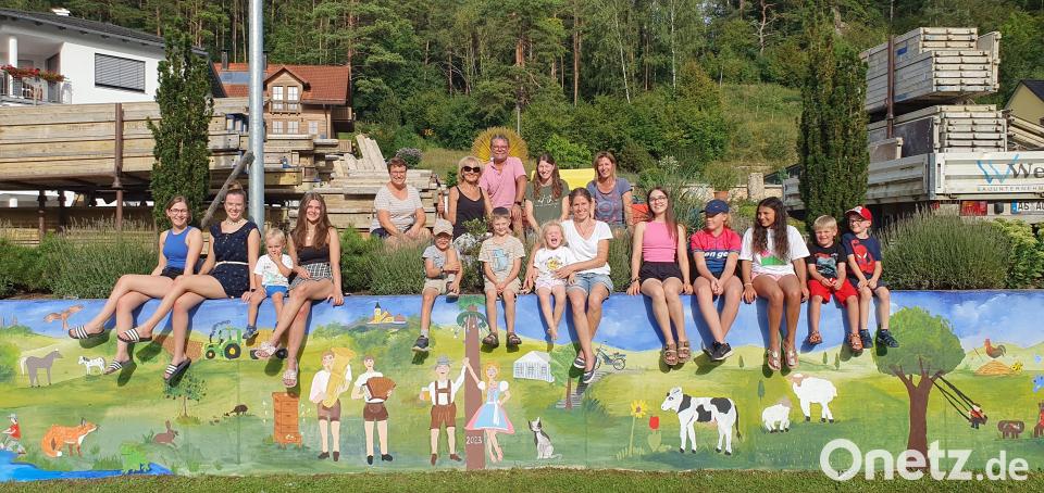 Eine Malaktion veranstaltete der Obst- und Gartenbauverein Allersburg-Berghausen. Dabei wurde ein weiterer Teil der grauen Betonmauer rund um den Dorfplatz künstlerisch gestaltet. Unter der Leitung von Sieglinde Siegert nahmen Jung und Alt bei strahlendem Sonnenschein die Pinsel in die Hand und trugen maßgeblich zur Verschönerung des Herzstücks von Allersburg bei. Zur Begeisterung aller drehte sich das Motto dieses Jahr um das Thema Dorfleben, was viel Raum für Kreativität bot. Von Tieren an der Lauterach bis hin zur Feldarbeit und einem Mofa wurden zahlreiche verschiedene Motive umgesetzt. Das Zentrum des Bildes besteht aus einem Kirwapaar, das um einen Baum tanzt und dabei von zwei Musikanten begleitet wird. Dieses für die Maler thematisch unverzichtbare Element ließ bereits die Vorfreude auf die Kirwa wachsen. Voller Stolz und mit einer Kugel Eis endete für die Teilnehmer ein produktiver Tag.