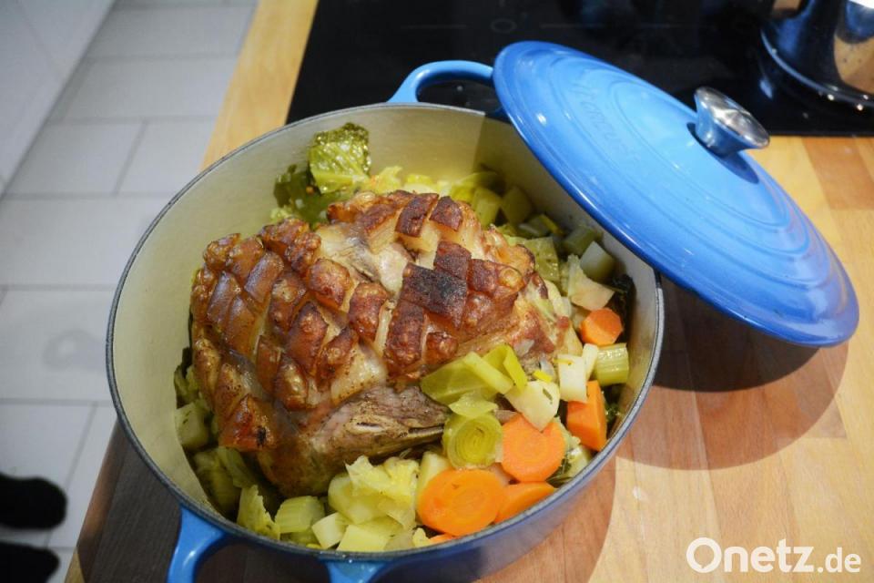 Den Schweinerücken mit der Schwarte nach oben auf das Gemüse legen und das Ganze rund 35 Minuten schmoren lassen. Das Fleisch in grobe Scheiden schneiden und auf dem Gemüse anrichten.