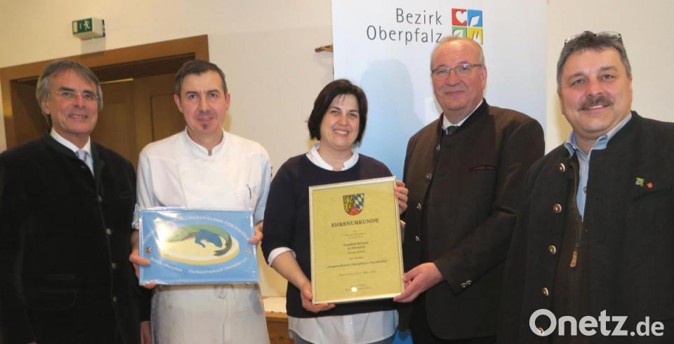 Das Siegel "Ausgezeichnete Oberpfälzer Fischküche" haben bislang 29 Gasthöfe in der Oberpfalz bekommen. "Nicht jedes Restaurant, das Fisch auf der Speisekarte stehen hat, bekommt das Prädikat", gibt der Bezirkstagspräsident zu verstehen. Da müsse vielmehr "eine außergewöhnliche Zubereitung und Verarbeitung von einheimischem Fisch" dahinterstehen. So wie bei der Familie Schiesl, die dem Produkt "Fisch aus der Region" besondere Bedeutung beimesse. Mit der Auszeichnung und dem dazu gehörenden Schild werde für jeden nach außen hin sichtbar, so der Präsident, "dass hier im Gasthof Schiesl eine hervorragende Oberpfälzer Fischküche zu Hause ist". An der Urkundenverleihung nahm neben Vertretern der Teichwirtschaft Regierungspräsident Axel Bartelt teil.