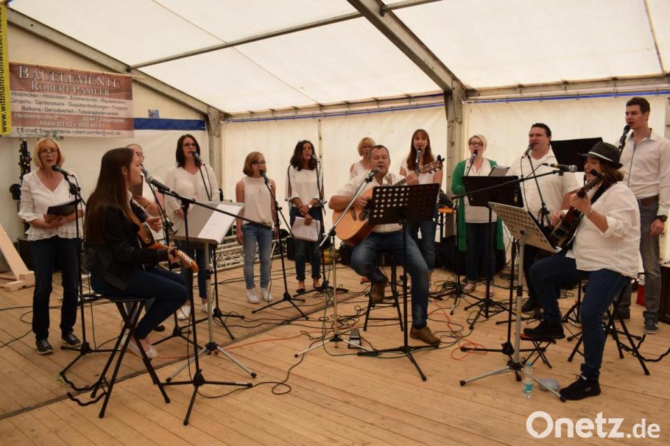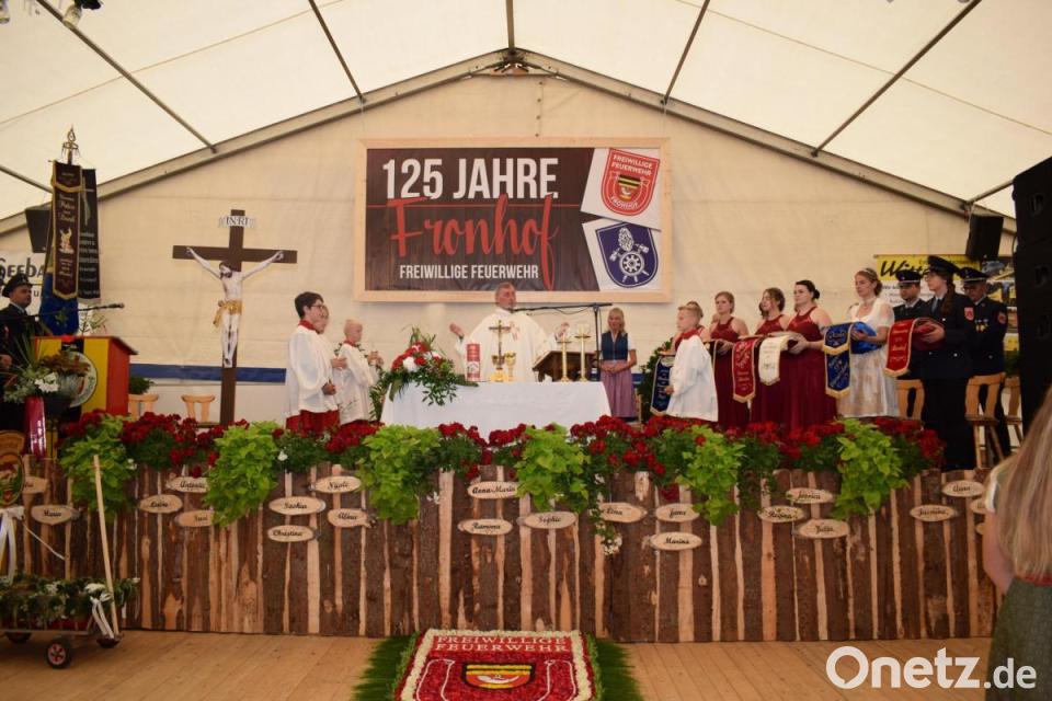 Trotz der anstrengenden zwei Tage, die bereits hinter der Feuerwehr lagen, wollte niemand beim Höhepunkt des Jubiläumsfestes fehlen. Mit dem Lied "I bin do" begrüßte der Lobpreischor "HoamaTakt" die vielen Gottesdienstbesucher. Den Gottesdienst feierte BGR Pfarrer Hans Bauer, ein gebürtiger Altendorfer, der bereits in den 60er Jahren als Ministrant Dienst am Altar der Schlosskapelle in Fronhof leistete. Am Beispiel dieser Kapelle, für deren Erhalt und Renovierung die Dorfgemeinschaft immer wieder gefordert wird, zeigte Pfarrer Hans Bauer den großen Gemeinschaftssinn auf, der in der Bevölkerung von Fronhof herrscht und der sich seit 125 Jahren in der Feuerwehr widerspiegelt.