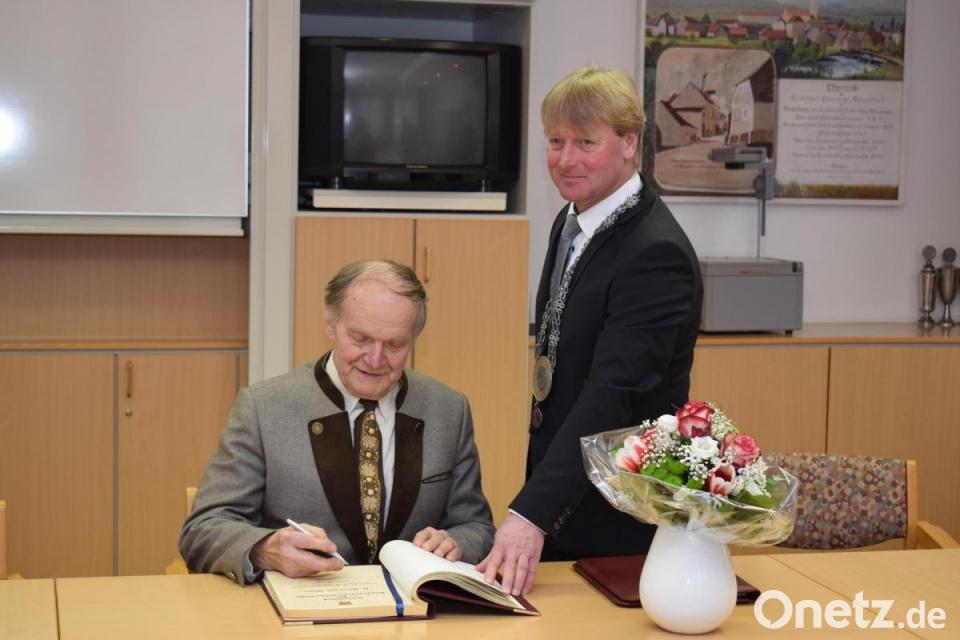 In seiner Laudatio blickte der Bürgermeister auf das ehrenamtliche Wirken von Hermann Haas zurück. Allein in 13 Vereinen und Institutionen der Gemeinde hatte er in den zurückliegenden fünf Jahrzehnten ein Funktion übernommen. Sein fundiertes Wissen und die Gabe, Ereignisse schriftlich darzustellen, machten ihn zum begehrten Autor bei der Erstellung von fünf Festschriften zu den verschiedenen Vereinsjubiläen. Auch als lokaler Berichterstatter für den Neuen Tag berichtete er 51 Jahre aus dem Rathaus.