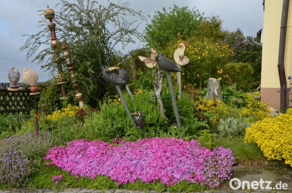 Bei Familie Völkl in der Waldauer Straße in Altenstadt bei Vohenstrauß recken Gockel und Raben fast spitzbübisch dreinblickend ihre Schnäbel im reichblühenden Garten in den Frühlingshimmel. Wie sie ihre Hälse strecken, so scheint es, wollen alle auf das Foto. Das Seifenkraut vernimmt schon das verheißungsvolle Summen einer Biene. Die künstlerisch gestalteten Tonsäulen rahmen das tierische Ambiente ein. Der Garten von Monika Völkl ist ein Rückzugsort, still, geschützt. Die blühenden Pflanzen schmiegen sich an das Haus, das Sonnenwärme speichert und vor kalten Winden schützt. In der Nähe des Fliederbuschs und Ranunkelstrauchs gibt es Plätze zum Innehalten und Staunen. Davor fühlen sich im fortlaufenden Jahreskreis Bergsteinkraut, Edelwicken, Mohn oder der Polsterphlox wohl. Geblüht wird in diesem Gartenidyll immer und überall. Ein Lobgesang auf die echten Schönheiten vom Land.