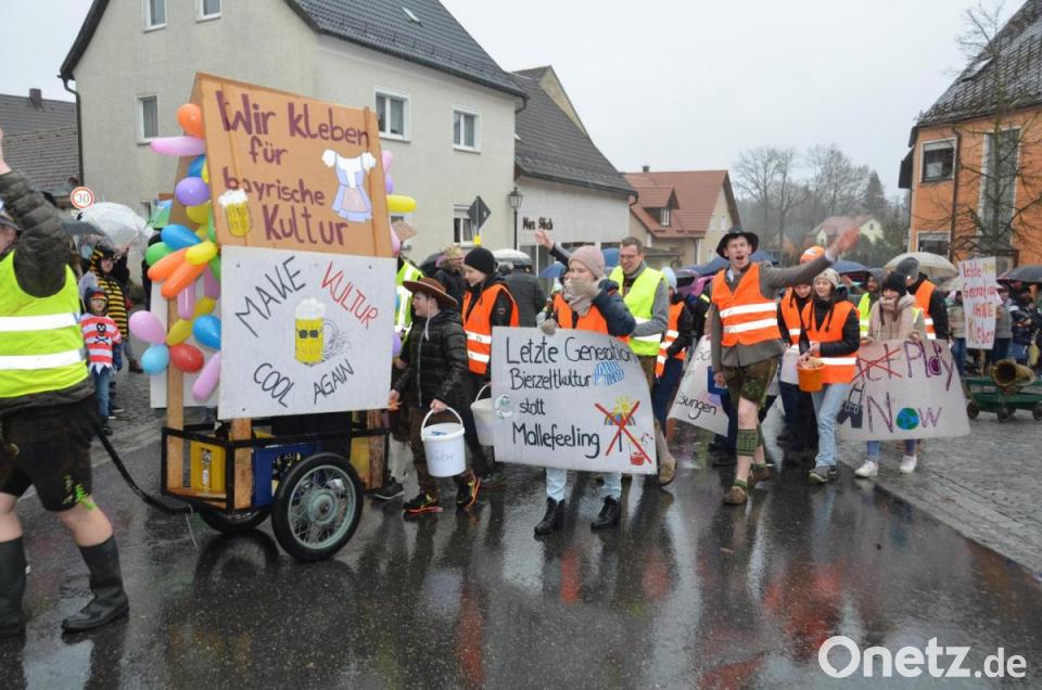 Der Faschingsverein Vohenstrauß führte die Kindergarde 2027 mit einem Kindergarde-Aufzuchtset vor. „Wir hegen und pflegen unseren Nachwuchs. Hier sprießt die Kindergarde von morgen.“ Die Fitnessgeräte am Bocklradweg waren der Fußgruppe „Muckes“ einen Faschingsspaß wert. „Fitnessgeräte auf freier Flur, da fragt man sich, was soll das nur? Wer will denn so was haben, wir hätten doch andere Ausgaben“, prangerten sie diese Anschaffung an. Mit „Die letzte Musik-Generation, eine Generation ohne Kleber“, nahm sich Kapellmeister Josef Wolfrath mit der Roggensteiner Jugendkapelle eines packenden Themas an. „Frühschoppen schaffen Lösungen“ und „Wir kleben für die bayerische Kultur“, meinten die Kulturaktivisten aus dem Luhetal.
