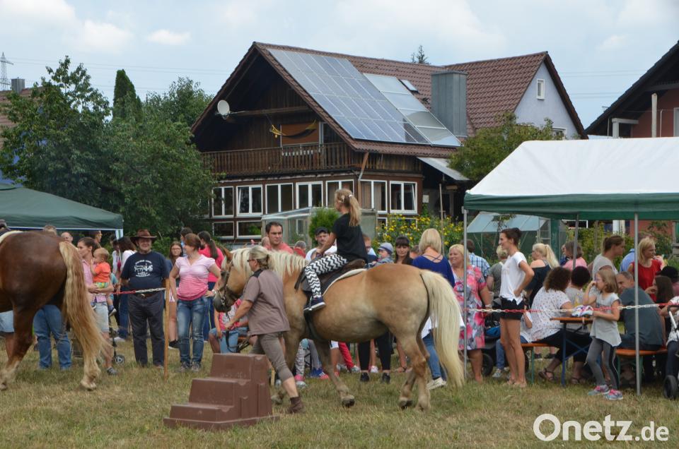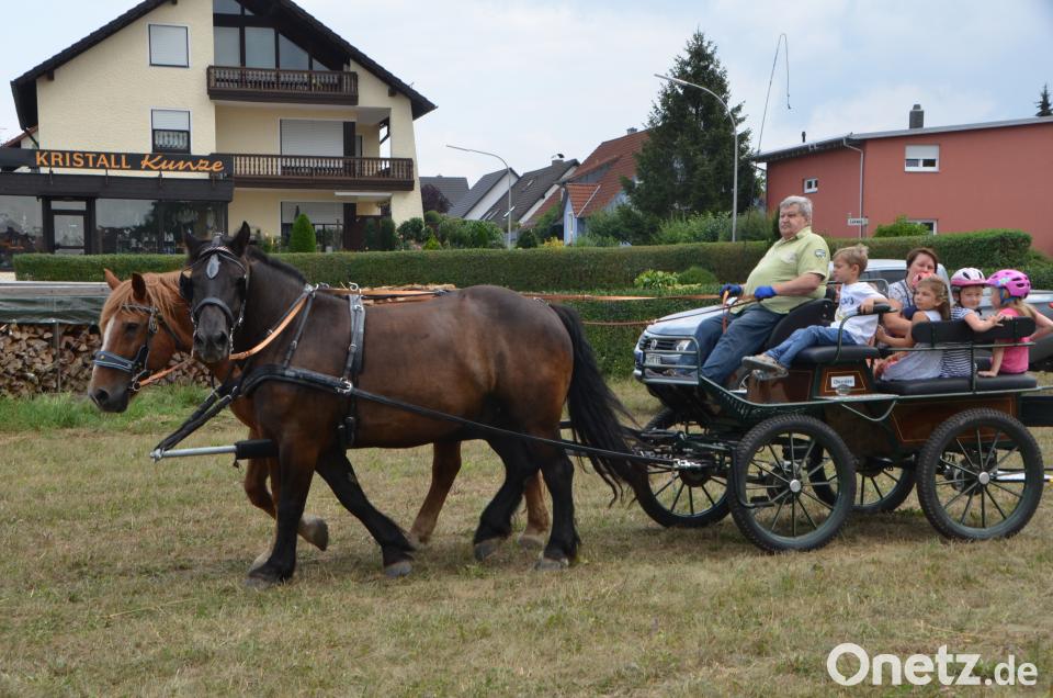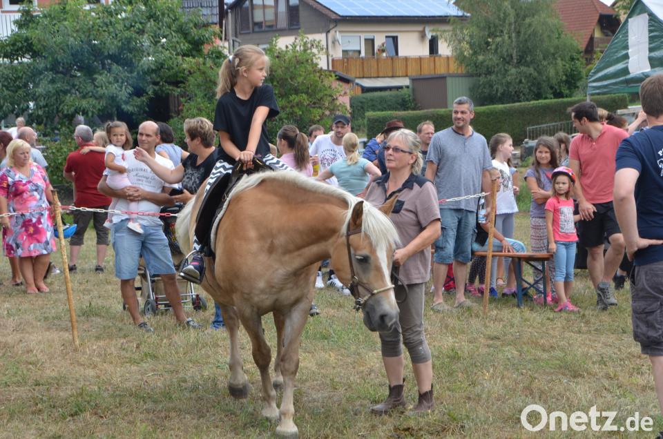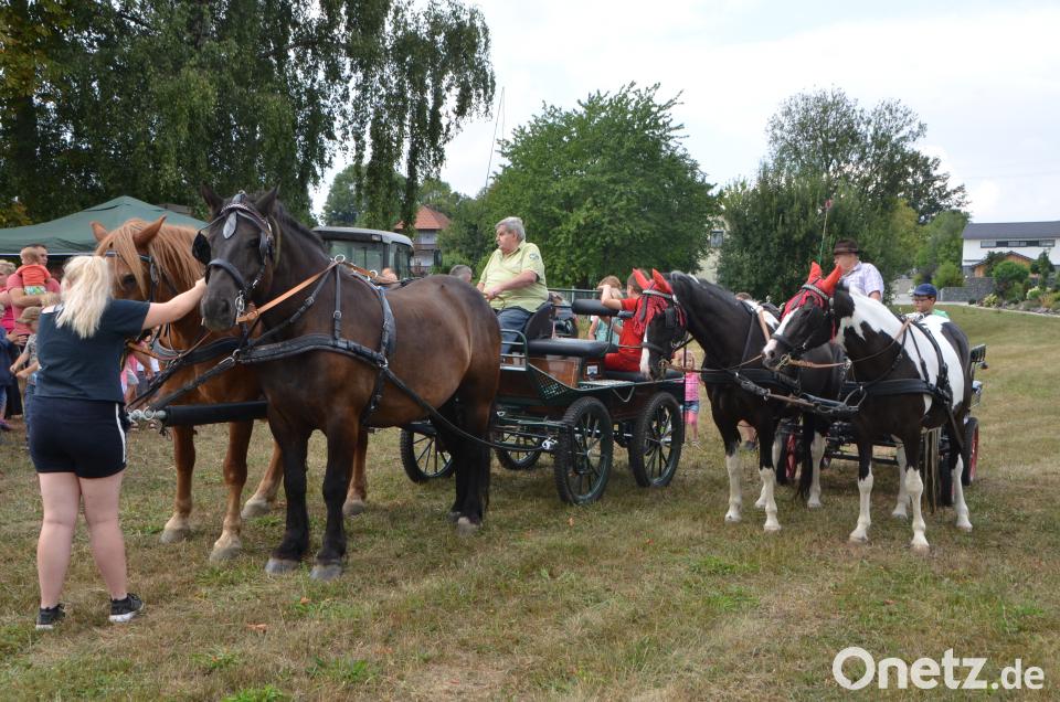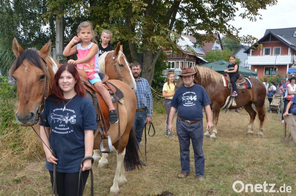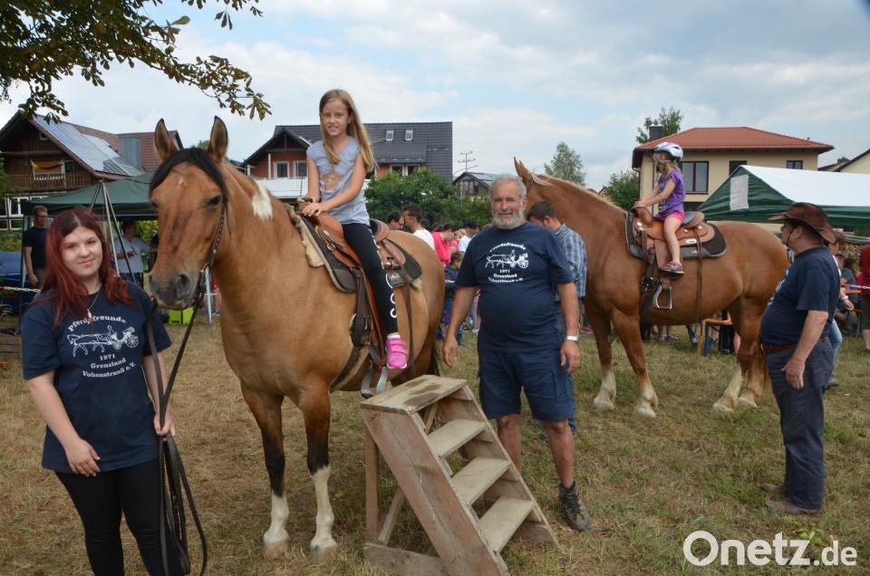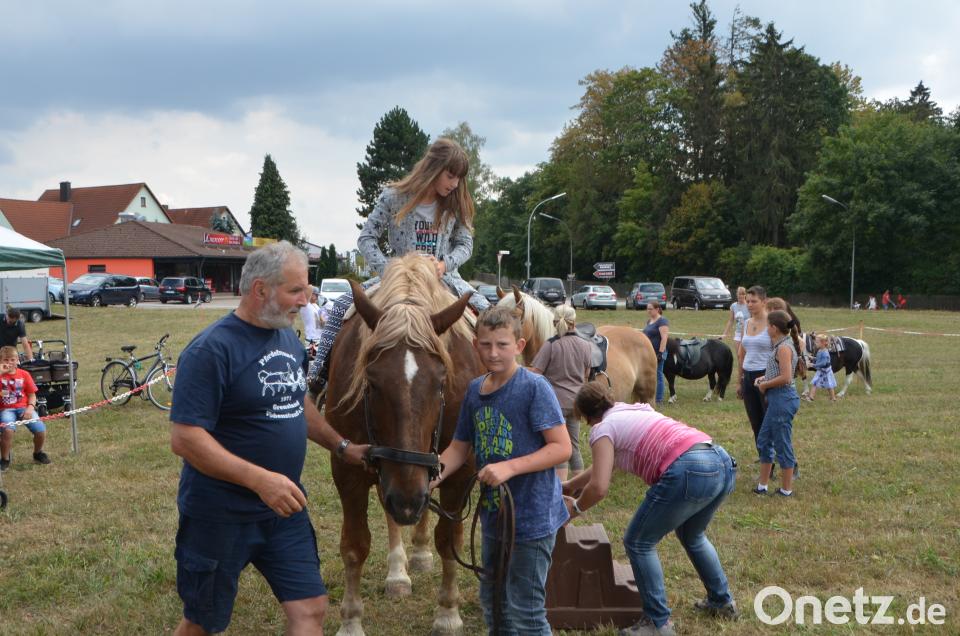Das weitläufige Wiesengelände wurde zu einer riesigen Pferdekoppel, auf der sich die Mädchen und Buben für einen Ritt oder für eine Kutschenfahrt anstellten. Ebenso war wieder Otto Mühlhofer mit seinem Kaltblutgespann "Jackl" und "Lucki" dabei, die laut wiehernd auf sich aufmerksam machten.