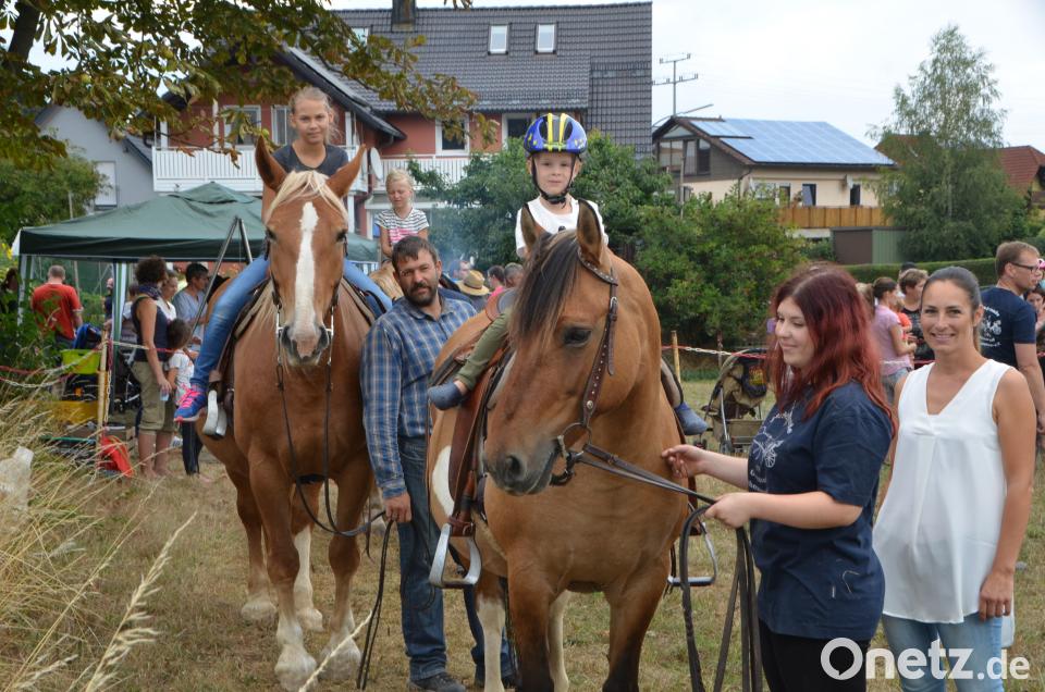 Damit die Kinder leichter die Pferderücken erklimmen konnten, stellten die Pferdefreunde mit ihrem Vorsitzenden Anton Birner eigens kleine Treppen als Aufstiegshilfe bereit. Meist ohne Scheu näherten sich die Kinder den Vierbeinern und fassten auch die helfende Hand der Pferdebesitzer. Über einem Lagerfeuer köchelte heißes Wasser für Wiener Würstchen. Dazu spendierten die Veranstalter eine Limonade. Für die wartenden Eltern bot sich die Gelegenheit, bei einer Tasse Kaffee und Kuchen die Zeit bei angenehmen sommerlichen Temperaturen zu genießen. Die kleinen Pferdefreunde bekamen nicht genug von den Probe-Reitstunden und nahmen jede Herausforderung an.