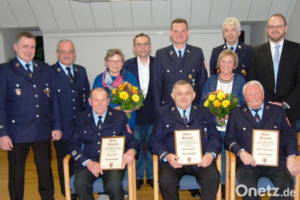Vorsitzender Wolfgang Müller würdigte beim Kameradschaftsabend die Verdienste von Hans Füssl, Peter Spachtholz und Hans Petz. Ihnen gratulierten unter anderem Landrat Andreas Meier, Bürgermeister Ernst Schicketanz, Kreisbrandrat Marco Saller und Kommandant Gottfried Amschl.