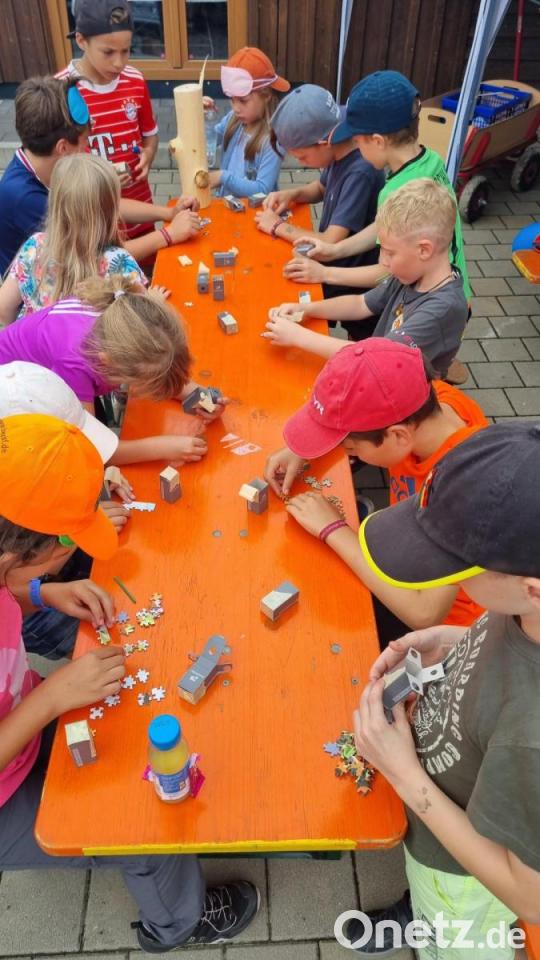 Mit 16 Kindern zwischen 5 und 11 Jahren startete der Förderverein Hais beim Ferienprogramm am Samstag zur Schnitzeljagd in den Wald. Da der Regen rechtzeitig aufgehört hatte, konnten die zwölf Stationen im angrenzenden Waldgebiet und direkt am Haisl gesucht werden. An den Stationen mussten Tiergeräusche erraten, ein Wald-Parcours mit verbundenen Augen absolviert, ein Luftballon-Rennen, ein halbes Kilo eines Baumstamm abgeschätzt und gesägt werden. Zapfen-Zielwerfen, ein Wald-Quiz oder "Was gehört nicht in den Wald?" waren die nächsten Aufgaben. An der letzten Station wartete 40 Boxen mit jeweils 25 Teilen eines 1000-Teile Puzzles mit einem Kinder-Wald-Motiv. Alle teilnehmenden Kinder erhielten ein 24-Teile-Puzzle zur Erinnerung geschenkt. Nach der erfolgreichen Jagd gab es Stockbrot am Lagerfeuer.