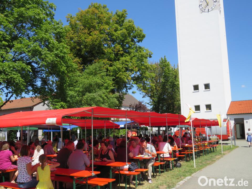 Nach dem geistlichen Teil waren alle Besucher zum Feiern auf die Wiese vor der neuen Pfarrkirche eingeladen. Viele ersparten sich das Kochen und ließen sich mittags Rollbraten mit Knödel schmecken. Außerdem waren Bratwürste, Steaks und Käse mit Brezen gefragt. Dazu gab es kühlen Eismann-Zoigl. Abgerundet wurde das kulinarische Angebot mit Kaffee und Kuchen. Die Kinder durften sich im Garten des katholischen Kindergartens vergnügen.