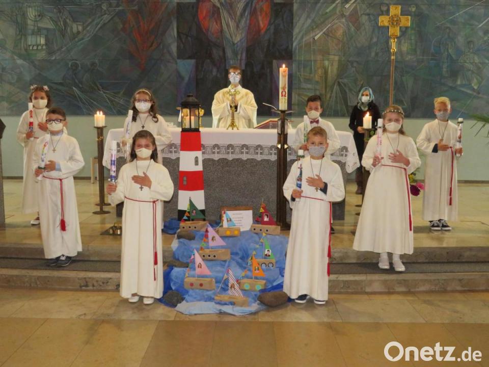In einer Tischgruppe haben sich die vier Mädchen und vier Buben unter dem Motto „Jesus und unser Licht“ auf den großen Tag vorbereitet. Der Leuchtturm mit den Bildern der Kinder vor dem Altar zeigte das Licht, dass Jesus in die Welt gebracht habe. Ausgehend vom Glaubensmotto verdeutlichte Pfarrer Kopp den Kindern die Bedeutung des Leibes Christi für deren Leben. "Die Vereinigung in der Kommunion schafft eine tiefere Gemeinschaft mit dem Herrn, durch die sie im täglichen Handeln zum Guten gestärkt werden, die Gott immer wieder neu zur Mitte des Lebens macht und sie beständig in Freude auf seinen Wegen gehen lässt." Er hielt die Erstkommunikanten an, dieses Geschenk fruchtbar werden zu lassen.
