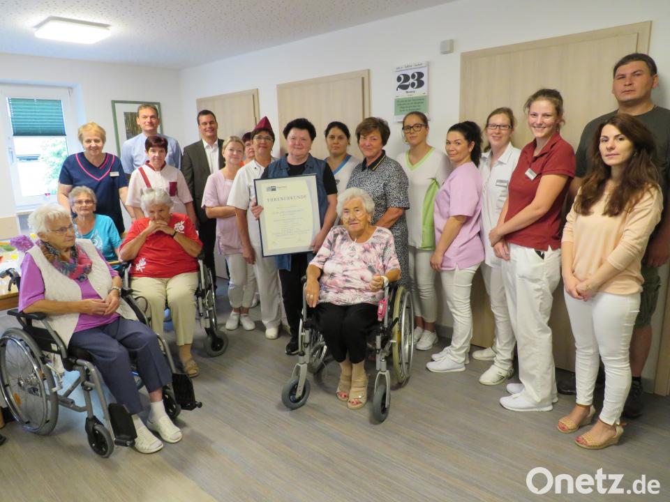 Mit einer Urkunde der Industrie- und Handelskammer Regensburg zeichnete Geschäftsstellenleiter Florian Rieder die Pflegekraft Hildegard Krischnowsky für 20 Jahre im Dienst des Seniorenheim Löffler aus.