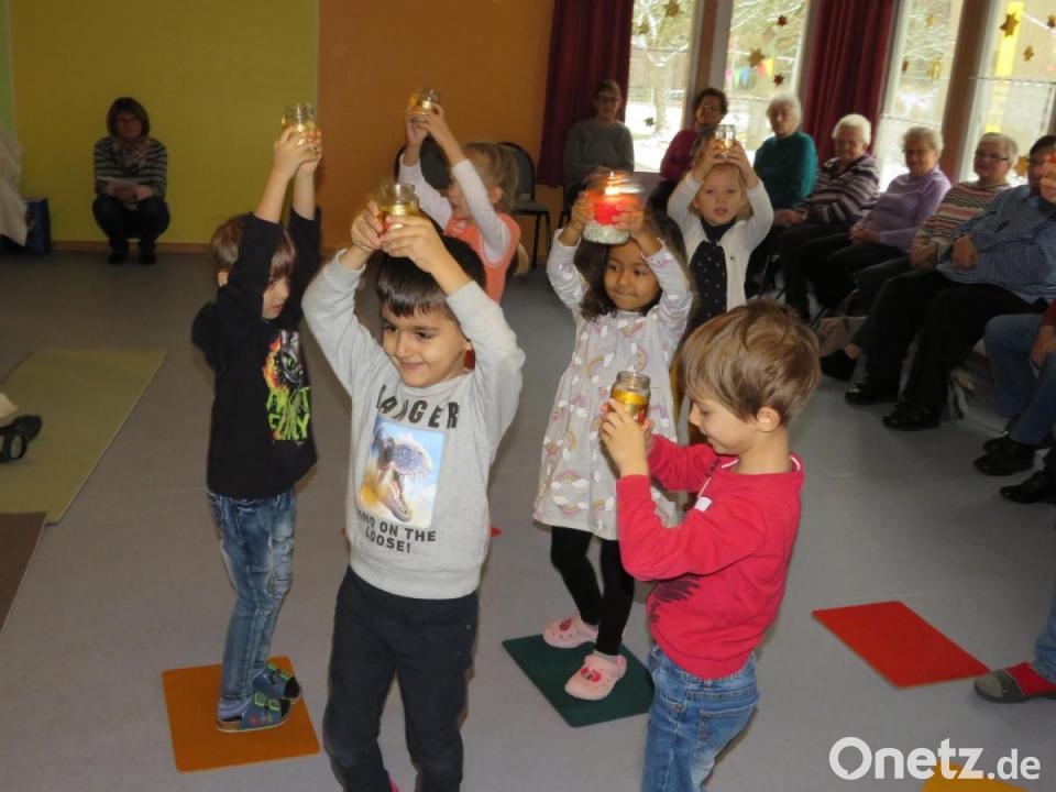 Mit freudigen Gesichtern sangen die Kleinen für die älteren Gäste. Zehn Mitglieder des Altenclubs und ihre Leiterin Evi Kamm genossen die Darbietungen. „Eine Kerze leuchtet weit“ und „Lasst uns froh und munter sein“ schallte es durch die Kindertagesstätte. Rund um den Tisch mit dem Adventskranz zeigten die "Midis" den Lichtertanz. Die "Maxi"-Sprecher verteilten danach einen kleinen Christstollen an die Gäste. Kaffee, Punsch und Plätzchen rundeten die adventliche Feier ab.