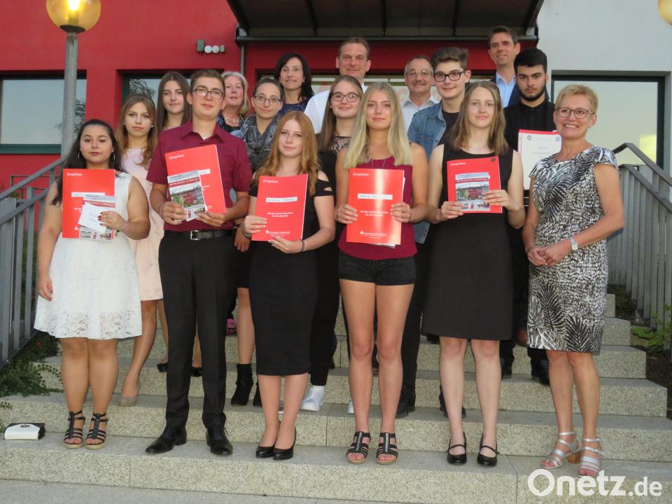Bei der Abschlussfeier gibt es Auszeichnungen für die besten Mittelschüler. Vorne von links: Kader Karayol, Franziska Buckenleib, Michelle Seidel, Lukas Bruischütz, Jacqueline Holzer, Michelle Varnhold, Julia Schmidt, Marie Adam, Andreas Schmidt, Julia Stangl, Berdan Kayhalar und Schulleiterin Gabriele Reitinger-Maier. Hinten von links: Petra Schulenburg, Tanja Schiffmann, Ernst Schicketanz, Richard Neumann und Michael Neumann.