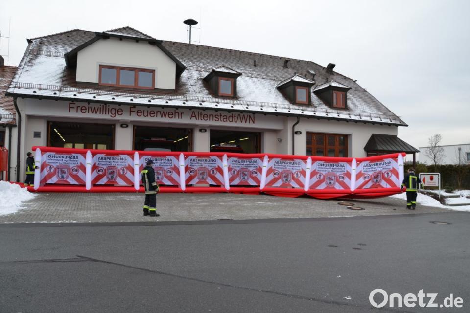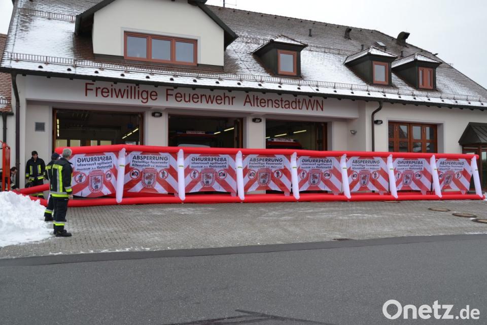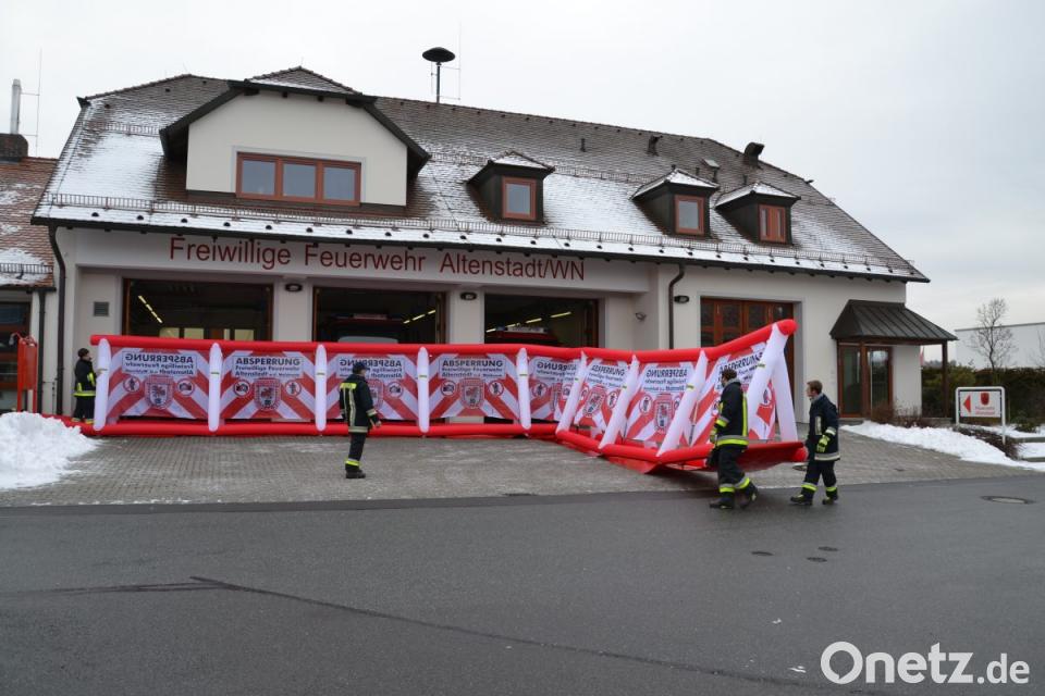 Die aufblasbare Sichtschutzwand ist 21 Meter lang, 2 Meter hoch, sie kann bei jedem Wetter von zwei Personen aufgebaut werden. Das alles dauert weniger als 2 Minuten. "Die Gafferwand funktioniert eigentlich wie eine Hüpfburg", erklärt Lindner. Durch ein Gebläse strömt beständig Luft in das Gebilde. Werde sie eingedrückt, stelle sie sich einfach wieder auf. "Auch wenn ein Loch drin ist, steht die Wand weiter." Zudem könne man die Mittelteile entfernen, um durchzugehen. Das Beste: "Die Wand passt in jeden Kofferraum, sie wiegt 27 Kilo." Kein eigener Wagen ist mehr nötig, die Wand ist nun Teil der Ausstattung. "Sie ist nicht aufgeführt als offizielles Einsatzmittel", erklärt Amschl. "Aber die anderen Feuerwehren im Landkreis können uns anfordern, falls sie sie brauchen."