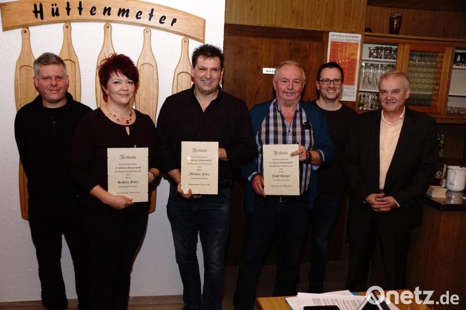 Vorsitzender Nickl hatte zur Versammlung drei Ehrenurkunden für 25-jährige Treue mitgebracht. Ganz vorne stand Regina Felix. Seit 2004 ist sie stellvertretende Vorsitzende und fleißige Mitarbeiterin im Heimatverein. Die Urkunde und eine Flasche Rotwein erhielten ebenfalls ihr Ehemann Markus sowie Josef Burger.
