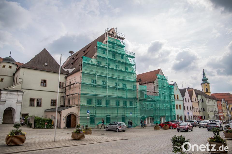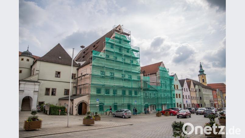 Das Alte Lobkowitzerschloss versteckt sich hinter einer riesigen, grünen Bauplane. Der Grund: Das dominante Gebäude schmückt sich für die 800-Jahr-Feier der Kreisstadt. Spätestens bis zur Festwoche Mitte Juli sollen die Anwesen Stadtplatz 34 und 36 in hellem Glanz erstrahlen, ebenso der Sockel des Neuen Schlosses. Die Malerarbeiten führt die Firma Rewitzer aus Pleystein aus. Das Gerüst kommt von der Firma Weig aus Waldthurn. Der Landkreis lässt sich den Fassadenanstrich 65000 Euro kosten. Bild: Lukas Meister