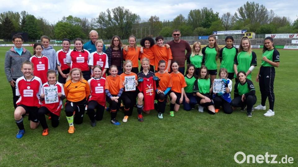 Die Mädchen aus dem Max-Reger-Gymnasium (orangefarbene Trikots) sind Stadtmeister im Mädchenfußball der Altersklasse III. Platz zwei ging an die Decker-Schulen (links), Rang drei an die Dreifaltigkeitsschule.