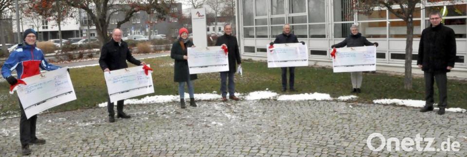 Die Organisationen (von links) von Bergwacht Amberg, Bereitschaftsleiter Johannes Potzel, Gemeinde Kümmersbruck, Bürgermeister Roland Strehl, Yvonne Roidl vom Organisationsteam-Krippenspiel St. Michael Poppenricht mit Vize-Bürgermeister Hermann Böhm, Hospizverein Amberg, Vorsitzender Georg Franz Fröhler, und Donum Vitae Amberg