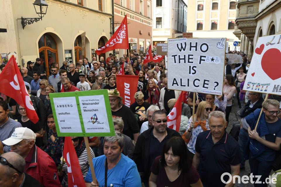 Vertreter verschiedener Verbände und Parteien sowie mehrere Ehrenamtliche geben auf einer Bühne Statements ab. Viele Demonstranten halten Schilder hoch mit Texten aus dem Grundgesetz oder Aufschriften wie "Lebe so, dass die AfD etwas dagegen hätte". Ein Plakat zeigt eine Halbe Bier einer Amberger Brauerei und den Zusatz: "Die einzige braune Flasche, die ich akzeptiere."