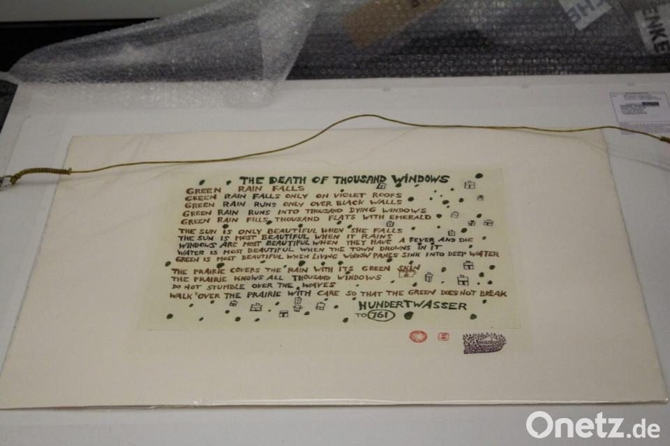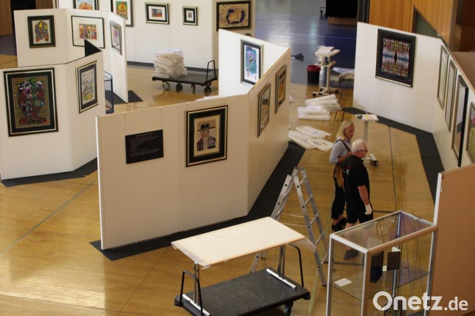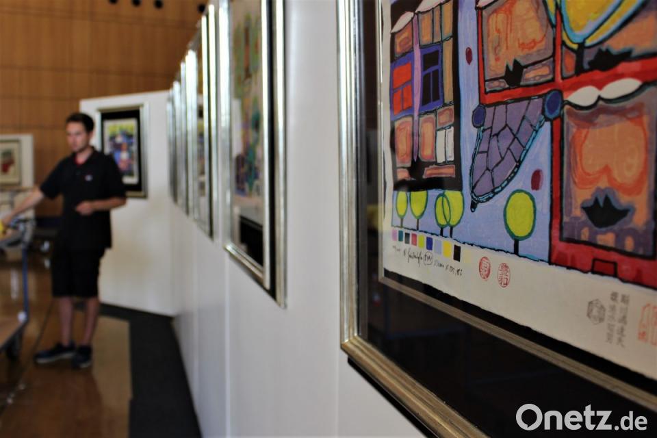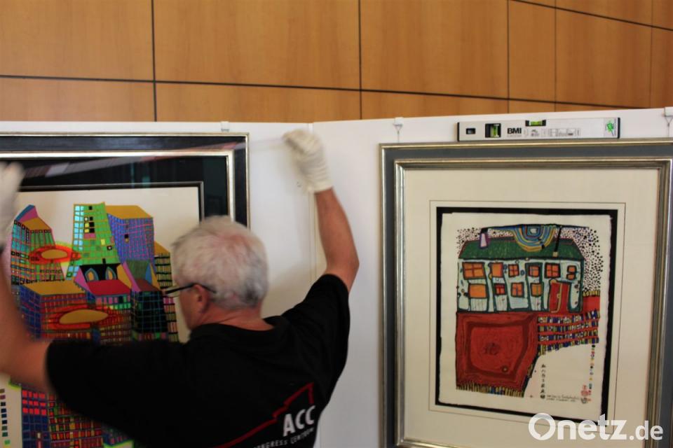 Erst 48 Stunden vor der Eröffnung beginnt der Aufbau. „Die Sicherheit geht vor“, erklärt Alexandra Kummert. Bis zu einer halben Million Euro werden mittlerweile bei Auktionen weltweit für einen echten Hundertwasser geboten. Diese Beträge stehen dennoch nicht in Relation zum tatsächlichen Marktwert. Ein Phänomen des Auflagen-Königs, der als erster Künstler überhaupt die handsignierte Graphik für die breite Masse erfand. Wie lange und wo sich die 77 Exponate in Obhut des Amberger Congress Centrums befinden und wann die Rückführung nach der Ausstellung erfolgt, darüber herrscht großes Schweigen. Auch über den monetären Wert wird nicht gesprochen. Nur, dass eine Von-Nagel-zu-Nagel-Versicherung abgeschlossen sei. Eine Kamera überwacht den Saal und sendet die Live-Übertragung zum eingesetzten Wachpersonal. Staub stelle eine große Brandgefahr dar. „Angeordnet ist eine tägliche Reinigung von sieben Uhr morgens bis sich die Türen wieder für Besucher öffnen“, sagt der Technische Leiter. Für den Zeitraum einer Ausstellung dieser Größenordnung wird rund um die Uhr gearbeitet.