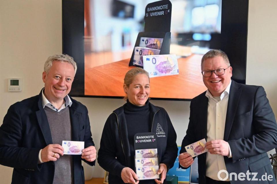 Was hat Amberg mit den Pyramiden von Gizeh, dem Eiffelturm, der Dresdner Frauenkirche und der Elbphilharmonie gemeinsam? Auch Amberg hat jetzt einen eigenen Geldschein, den 0-Euro-Schein. Das Sammlerstück wird in Kooperation mit derselben Druckerei hergestellt, die auch die echten Geldscheine produziert. Es verfügt über eine Vielzahl von Sicherheitsmerkmalen wie Wasserzeichen, Kupferstreifen, Simultouch, Hologramm, Durchsichtregister, Sicherheitshintergrund der Gelddruckerei, fluoreszierende unsichtbare Tinte und eine individuelle Seriennummer, die bei jedem Schein einzigartig ist. Die Leiterin des Amtes für Tourismusförderung, Heike Kober, sowie Kultur- und Tourismusreferent Fabian Kern überreichten Oberbürgermeister Michael Cerny das erste Exemplar der Serie. Sie wurde in einer limitierten Kleinstauflage von 3000 Stück hergestellt und ist in der Tourist-Information Amberg erhältlich. Bei Abholung kostet der 0-Euro-Schein zwei Euro. Das Angebot gilt, solange der Vorrat reicht.