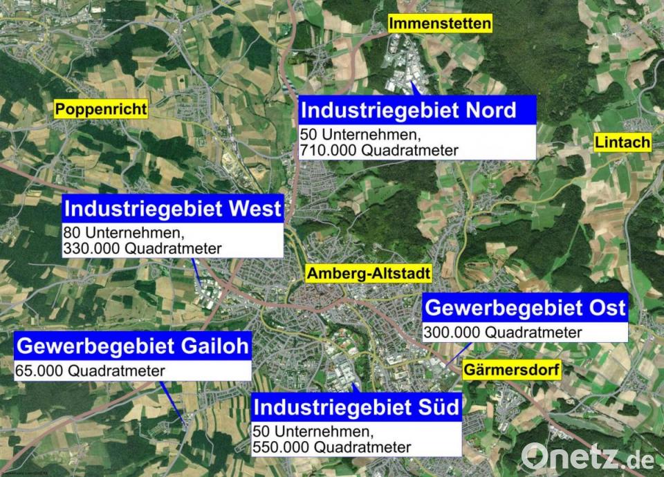 Die Gewerbebau verzeichnet auf ihrer Homepage in Amberg zwei Industriegebiete, drei Gewerbegebiete und zwei Dienstleistungszentren und ergänzt: „Ein weiteres Gewerbegebiet an der Autobahn A6 befindet sich in Aufstellung.“