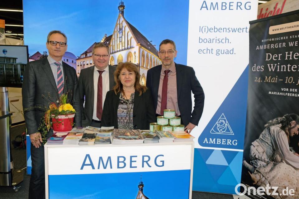 OB Michael Cerny, Kultur- und Tourismusreferent Wolfgang Dersch sowie Kulturamtsleiter Reiner Volkert nutzten die Gelegenheit, den Mitarbeitern der Tourist-Info einen Besuch abzustatten und gleichzeitig den neuen Messestand bei seinem allerersten Einsatz zu begutachten. Der neue Stand war laut Cerny jedoch nicht der einzige Grund zur Freude. "Die Maßnahmen und Aktivitäten unserer Tourist-Info tragen ausgezeichnete Früchte. Wir befinden uns, was die Ankunfts- und Übernachtungszahlen betrifft, deutlich im Aufwind." Insgesamt 87 954 Übernachtungen seien 2018 gezählt worden. Im Vergleich zum vergangenen Jahr entspreche das einem Plus von 14,5 Prozent. Mit einer durchschnittlichen Aufenthaltsdauer von zwei Tagen könne Amberg zudem die längste Verweildauer aller kreisfreien Städte der Oberpfalz vorweisen.