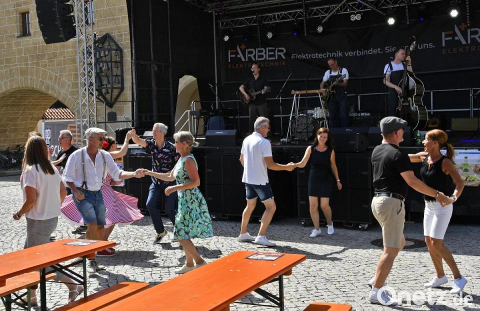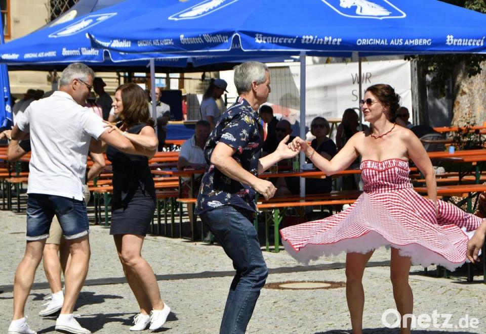 Während zu diesem Zeitpunkt auf den meisten Plätzen in der Amberger noch fürs Altstadtfest aufgebaut wurde, wurde im Innenhof des Landratsamtes am Samstagvormittag schon gefeiert: Die Sunny Bottom Boys gaben mit einem Rockabilly-Frühschoppen den Startschuss in zwei Tage volles Programm. Die Boys scharen immer eine treue Fangemeinde um sich, die begeistert Boogie tanzt – auch wenn es sommerlich heiß ist wie an diesem Wochenende in Amberg.