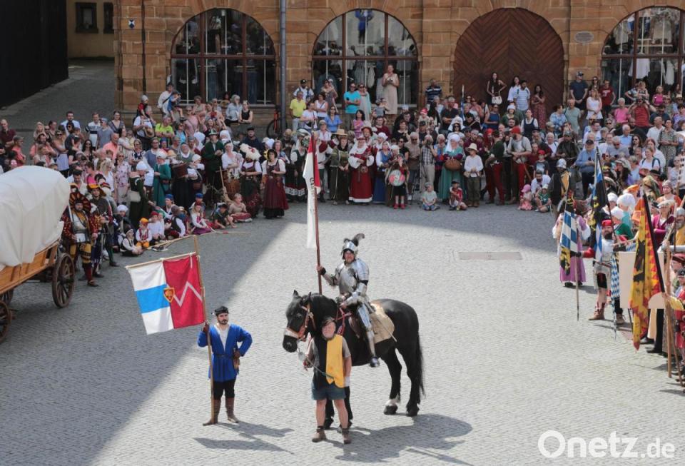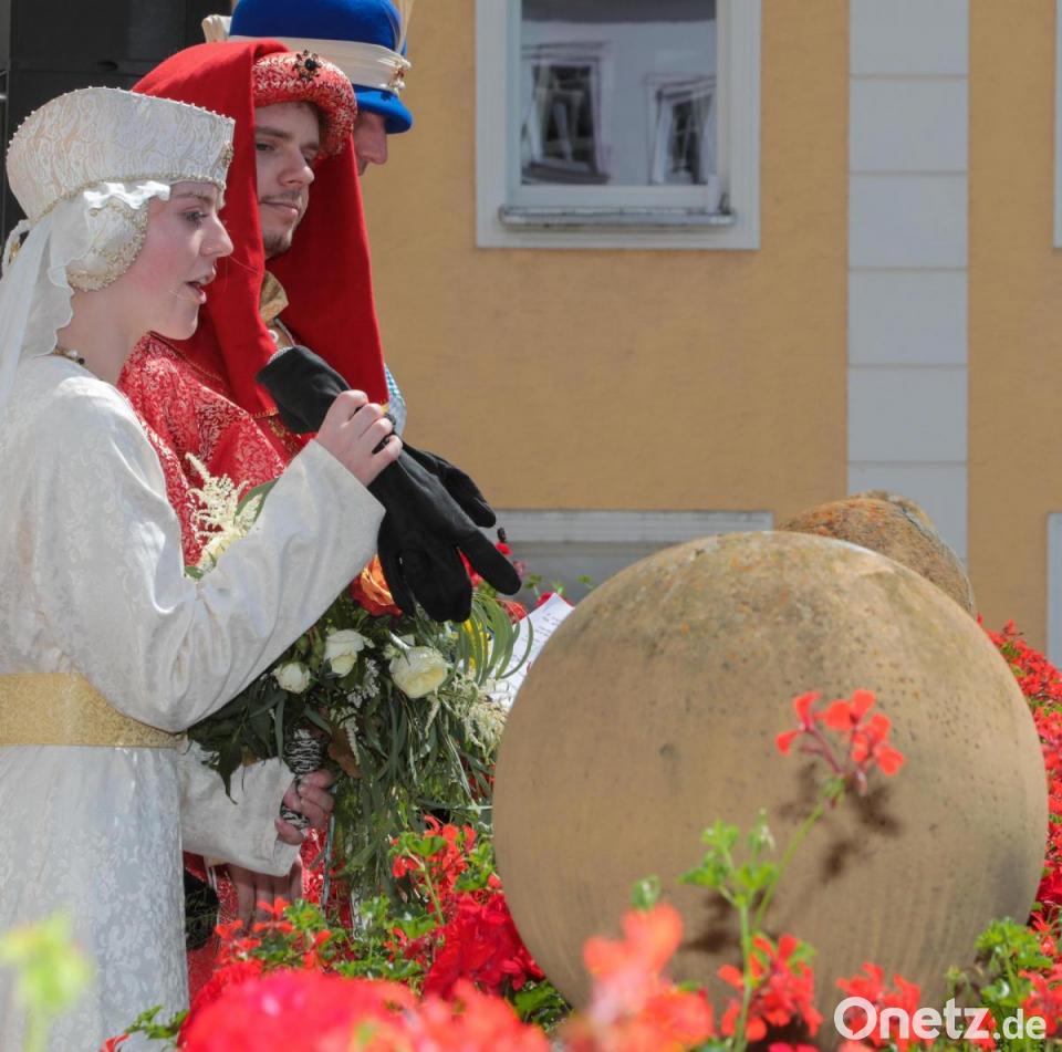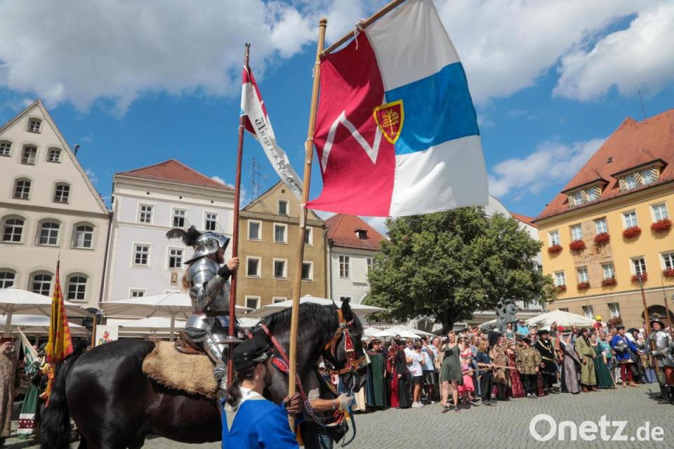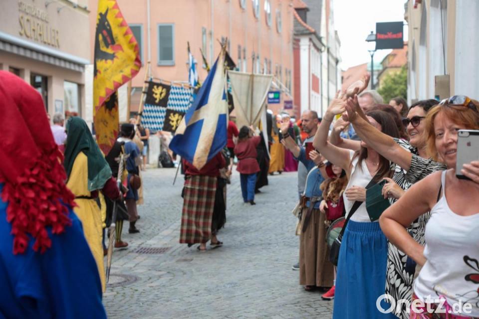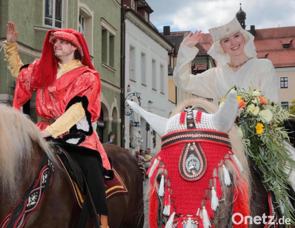 Am Samstag stand der Höhepunkt des Brunnenfests an, das im Rhythmus von zwei Jahren stattfindet und heuer noch etwas größer als das vergangene Mal ausfällt – der große historische Festzug vom Malteser zum Marktplatz, bei dem an die Amberger Hochzeit von 1474 erinnert wird, bei dem Pfalzgraf Philipp und Margarete von Bayern-Landshut in Amberg heirateten. Die Münchnerin Pauline Fuchs schlüpfte dabei in ihre Rolle als Margarete von Bayern-Landshut und Raphael Müller in die des Philipp. Prunkvoll, tosend und spektakulär ritten die beiden durch die Amberger Altstadt, um die Bürger Ambergs vom Balkon des Amberger Rathauses zu begrüßen.