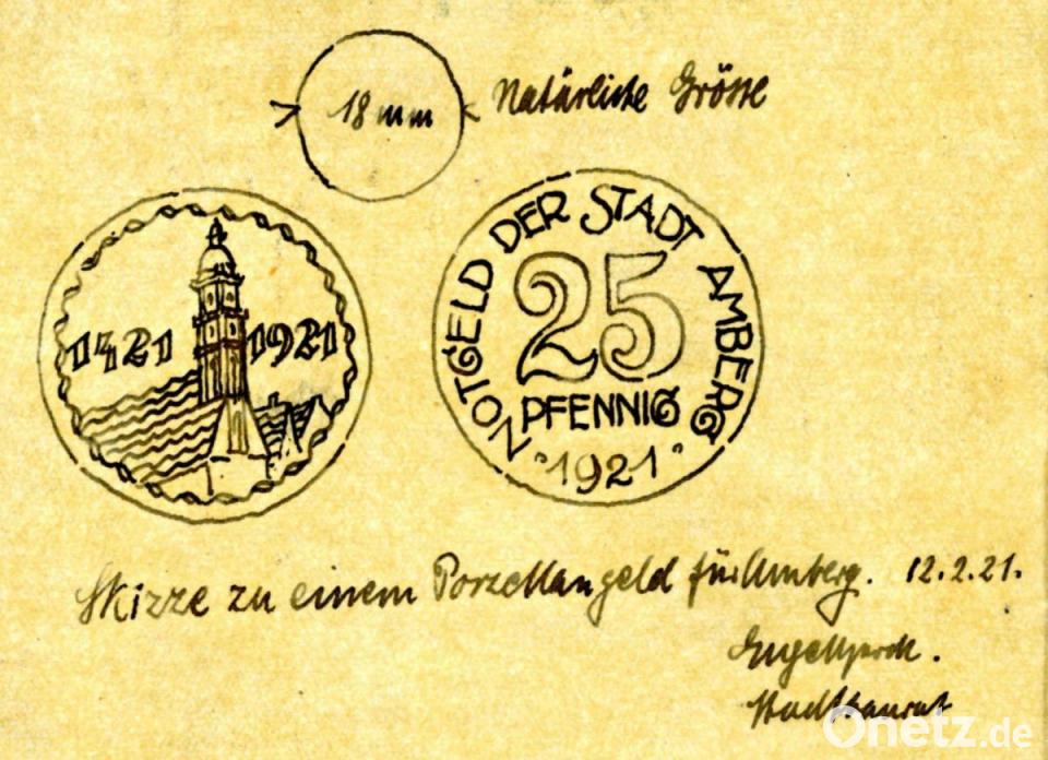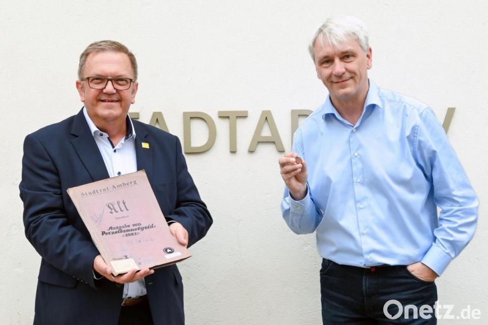 Daran erinnerten jetzt Ambergs Zweiter Bürgermeister Martin Preuß und der Leiter des Stadtarchivs, Andreas Erb. Dazu hatte der Archivar das exakt vor 100 Jahren herausgegebene Amberger „Stadtgeld“ aus Porzellan samt des dazugehörigen Schriftverkehrs aus dem Bestand heraussuchen lassen. „Einige dieser Stücke werden künftig auch im Amberger Stadtmuseum zu sehen sein“, wird Erb in einer Pressemitteilung der Stadt zitiert. Diese Leihgabe sei über einen neu in Angriff genommenen Objektaustauschs zwischen den beiden Einrichtungen erfolgt.