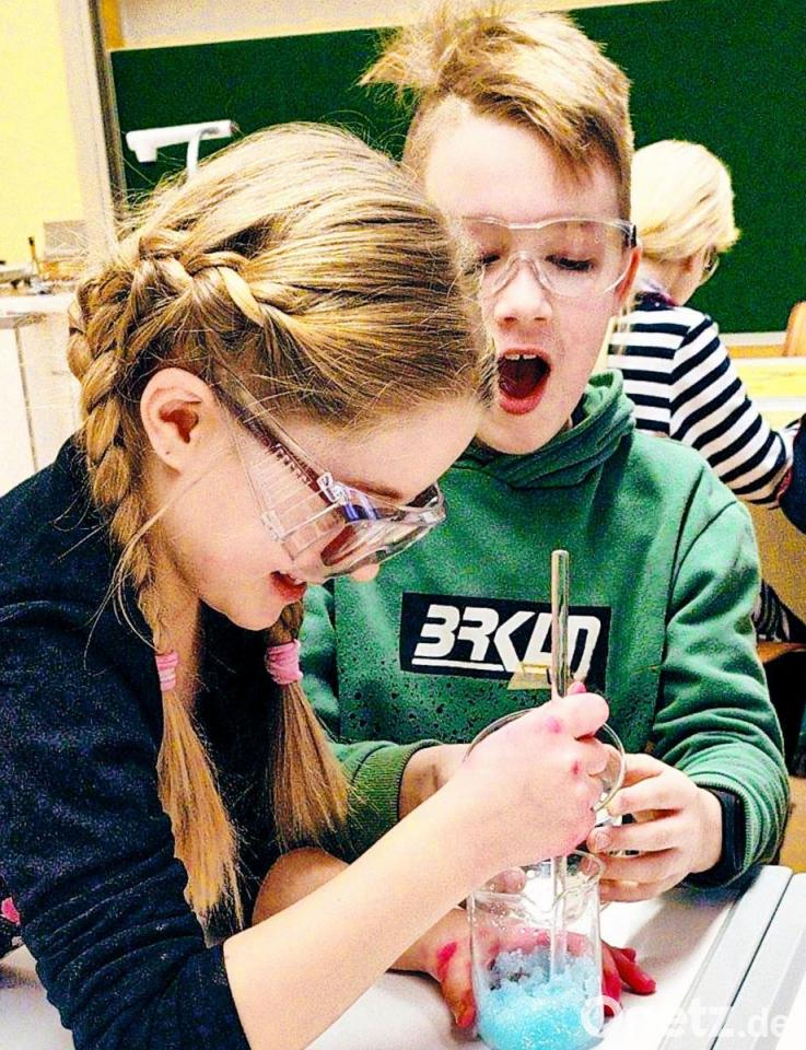 So galt es beispielsweise herauszufinden, weshalb eine geschälte Zitrone in Wasser untergeht, eine ungeschälte dagegen nicht. Die Ergebnisse wurden dann an die Mitglieder des P-Seminars zur Auswertung übermittelt. Zur Belohnung gab es nun für die 27 Mädchen und Buben den erwähnten Experimentiertag. So malten die Kinder mit einer unsichtbaren Geheimschrift und erlebten, wie man diese durch Besprühen mit Zauberwasser wieder sichtbar machen kann.