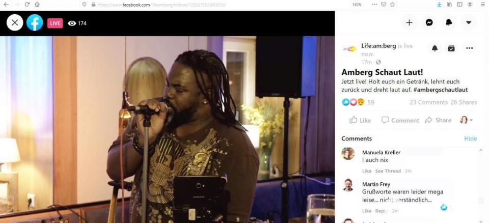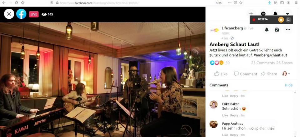 Freilich fehlte das Konzert-Gefühl, die Masse an Gästen zusammengerückt in einem Saal oder als Freiluft-Darbietung. Es fehlte der Bass, das Klatschen, die genießenden Gesichter der Zuschauer. Und den Musikern fehlte die Dankbarkeit in Form von Applaus. Nichtsdestotrotz, für einen Auftritt aus Lust an der Freude ohne Gage, erfreute „Amberg schaut laut“ mindestens 160 Gemüter im Live-Stream.