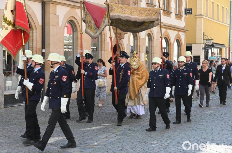 Im jährlichen Wechsel übernehmen die Pfarreien St. Martin und St. Georg die Organisation der Fronleichnamsprozession. Daher führte ihr Weg dieses Jahr „umgekehrt“ über Neustift, Schoßgraben und Regierungsstraße zum Marktplatz, dann auf geradem Weg zurück nach St. Georg. Die Handwerkerinnungen mit ihren Zunftfahnen und christliche Verbände führten die Fronleichnamsprozession an.