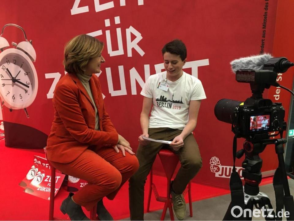 Wie MRG-Deutschlehrerin Veronika Frenzel mitteilt, interviewte Lukas Plößl die Ministerpräsidentin von Rheinland-Pfalz, Malu Dreyer, die bis zum Parteitag auch noch kommissarische Vorsitzende der SPD war. Danach waren Niedersachsens Ministerpräsident Stephan Weil sowie Berlins Regierender Bürgermeister Michael Müller an der Reihe. "Er hat eigenständig die Kontakte hergestellt, ist mit seiner Mutter zum Parteitag gefahren und sie hat die Interviews gefilmt", hebt Veronika Frenzel das journalistische Engagement ihres Schülers heraus.
