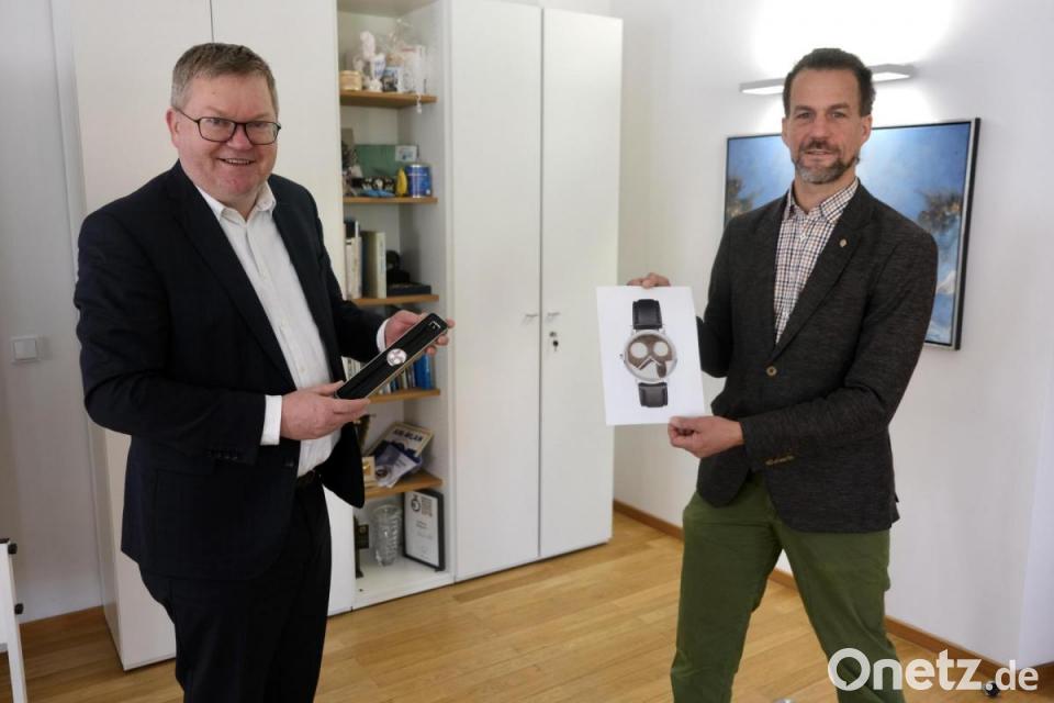 Der Amberger Goldschmied Sebastian von der Recke hatte vor fünf Jahren die Idee, zusammen mit verschiedenen Amberger Künstlern alle zwei Jahre eine sogenannte Amberger Stadt-Uhr zu schaffen. Nun konnte er dem Oberbürgermeister die neueste Kreation vorstellen. Die ersten Motive für das Ziffernblatt lieferten Marcus Treppesch, der für 2016 bis 2018 gleich zwei farbige Vorlagen schaffte. Daran schloss sich 2018 ein Motiv von Johann Sturcz an. Für die neue Stadt-Uhr schuf Erika Wakayama die Vorlage, die von der Recke nun dem Oberbürgermeister präsentierte. Die Uhr kommt mit einer limitierten Auflage von 50 Exemplaren auf den Markt zum Stückpreis von 125 Euro, heißt es. Wichtig sei, so von der Recke, dass die Uhr aufgrund ihrer Größe sowohl von Herren als auch von Damen getragen werden kann. Erhältlich ist sie in der Goldschmiede in der Regierungsstraße 51.