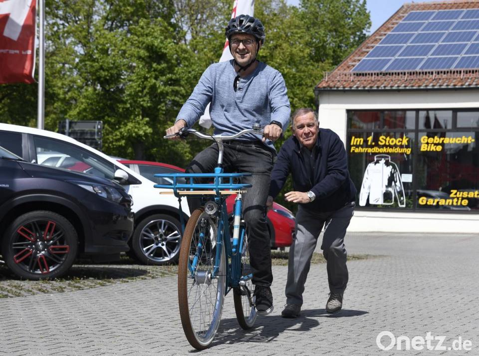 Dank des - auch finanziellen - Anschubs von Peter Stadler (rechts) verfügt die Redaktion jetzt über ein eigenes Dienstfahrrad im Retro-Look, das Redakteur Andreas Ascherl zur Jungfernfahrt abgeholt hat. Natürlich mit Redaktions-Fahrradhelm. Gut möglich, dass schon beim nächsten Termin der Reporter der AZ auf zwei statt vier Rädern erscheint. Was übrigens einige Kollegen ja ohnehin schon regelmäßig tun - bisher allerdings mit dem eigenen Bike.